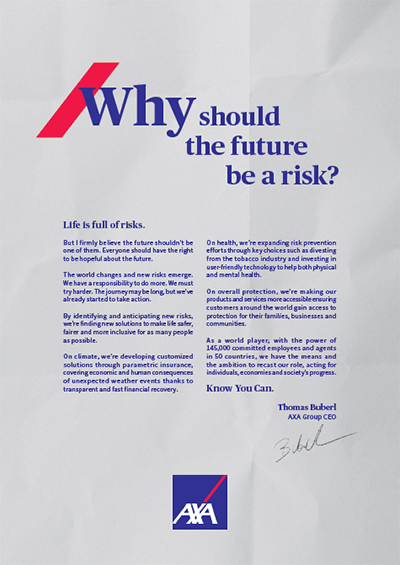 To do so, AXA is asking a simple yet provocative question: Why should the future be a risk?
