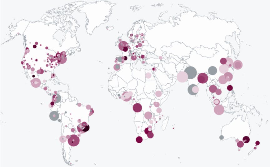 Illustration 1 : Les zones les plus sombres correspondent au risque le plus élevé. La taille des points représente la taille de la population des villes. (a)